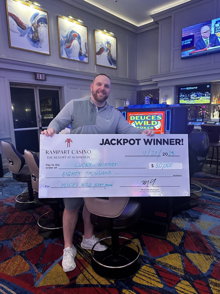LAS VEGAS – November 24, 2025 – A lucky guest struck it big this weekend at Rampart Casino at The Resort At Summerlin, taking home an impressive $80,000 while playing Deuces Wild Poker in the High Limit Room. The jackpot came on a Royal Flush, while making a $100 bet with a $20 denomination. Following the win, the guest, who is a regular visitor from Illinois, took photos with the winning check.