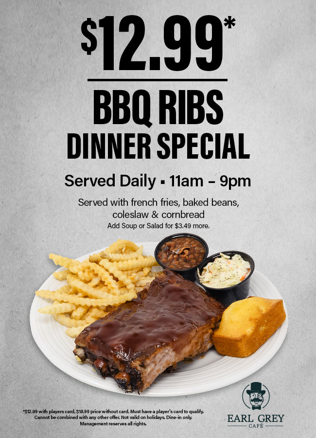 Our $12.99 BBQ Ribs Dinner Special is served daily from 11 a.m. to 9 p.m. Pork Spare Ribs, served with French Fries, Baked Beans, Coleslaw and Cornbread. Add soup or salad for $3.49 more. $18.99 without Rampart Rewards Card. Must have player’s card to qualify. Cannot combine offers. Dine in only. Follow us on Facebook, Instagram, and X to keep up with everything we have going on! For great dining deals, visit Earl Grey Café often to see what is new.