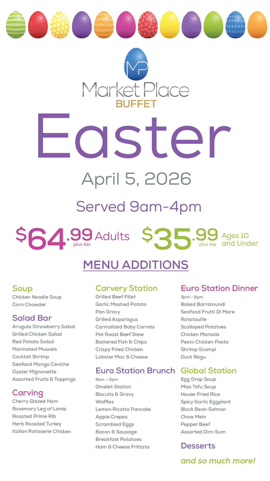 Sunday, April 5 from 9 am - 8 pmEnjoy Easter Buffet at Market Place Buffet.
