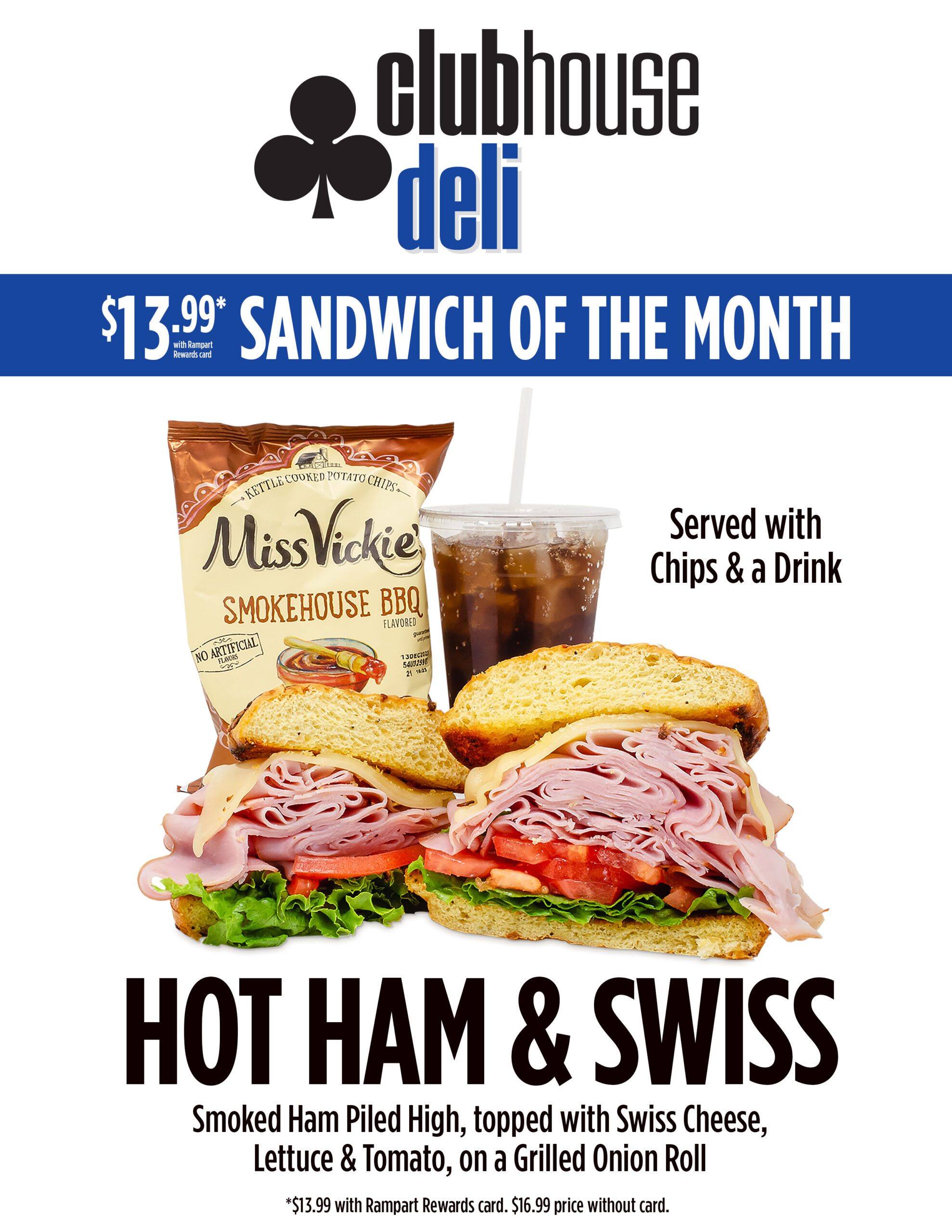 $13.99* Combo January Deli SpecialEnjoy the Hot Ham & Swiss combo meal deli special at Clubhouse Deli in January.