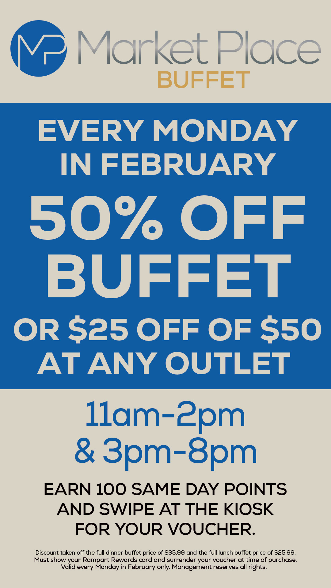 Every Monday in FebruaryMust earn 100 same-day points & swipe at the kiosk for voucher to receive promotion.