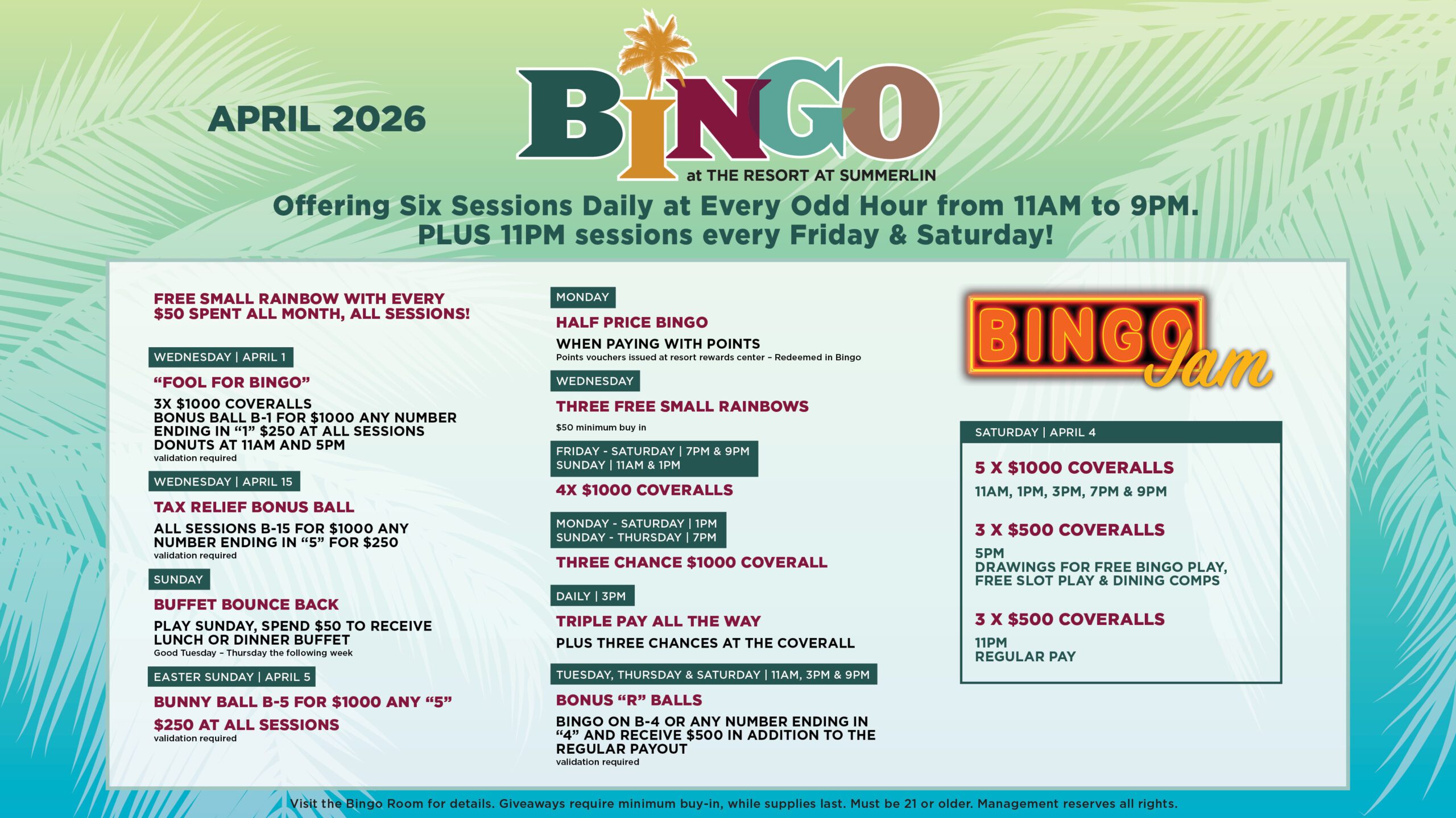 The Bingo Room opens daily at 10:00 am. Bingo sales begin 30 minutes before the start of each session. Rampart Rewards cardholders will earn rewards through Bingo play. Bingo play is cash only and players must be 21 years of age.