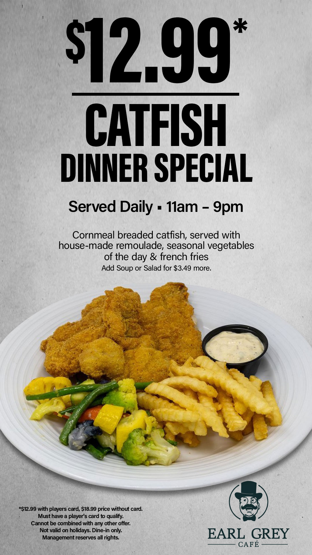 Our $12.99 Catfish Dinner Special is served daily from 11 a.m. to 9 p.m. Cornmeal breaded catfish, served with house-made remoulade, seasonal vegetables of the day & french fries. Dine in only. Add Soup or Salad for 3.49 more.
