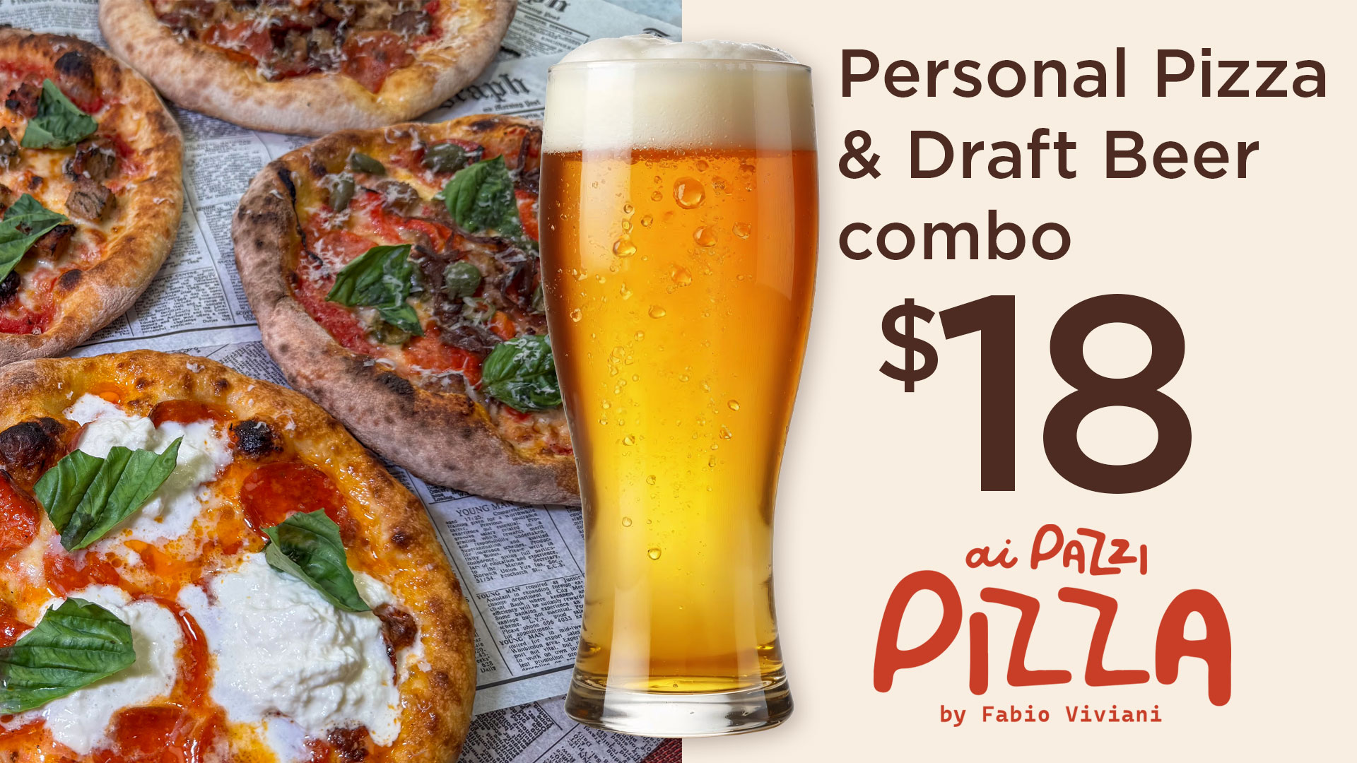 Enjoy a personal pizza and draft beer combo for $18 at ai Pazzi Pizza.