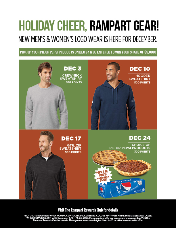 Rampart Casino offers the best Las Vegas Deals. Earn 500 base points each Wednesday December 3, 10 and 17, 2025, then swipe at the kiosk between 11 am and 7 pm to receive your gift. Plus earn 300 points on December 24 for your choice of pie or Pepsi. You keep the points! Limit 2 gifts per giveaway day. While supplies last. Visit Rampart Rewards club for details.