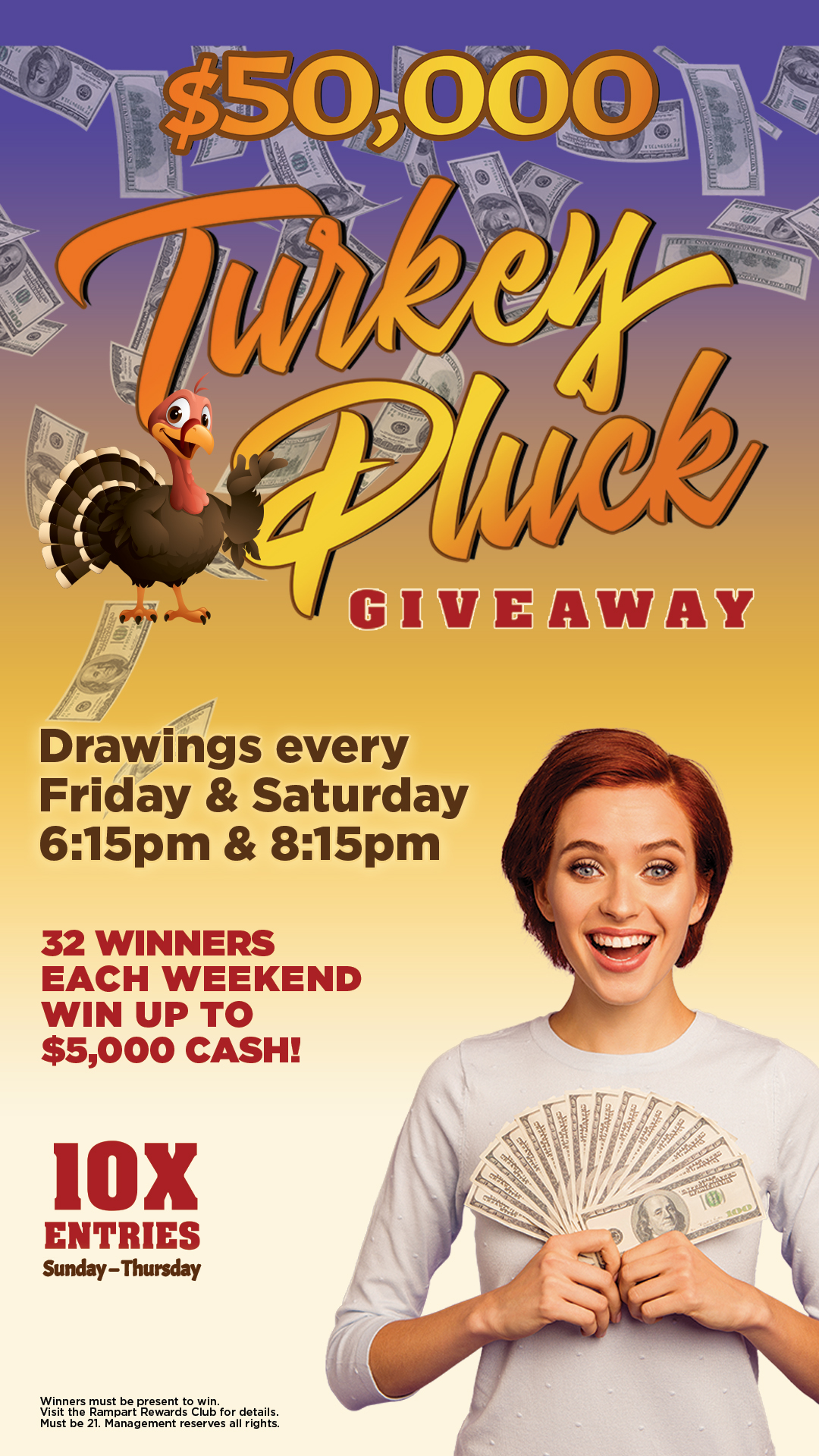 Looking for great Las Vegas Deals? We are hosting our $50,000 Turkey Pluck Giveaway Drawings Fridays and Saturdays November 7-29 at 6:15 pm and 8:15 pm.